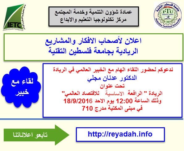 دعوة لكافة الطلبة الرياديين بجامعة فلسطين التقنية ،  لحضور اللقاء مع الخبير العالمي في الريادة د.عدنان مجلي” الساعة 12:00 في مبنى المكتبة مدرج 710 .