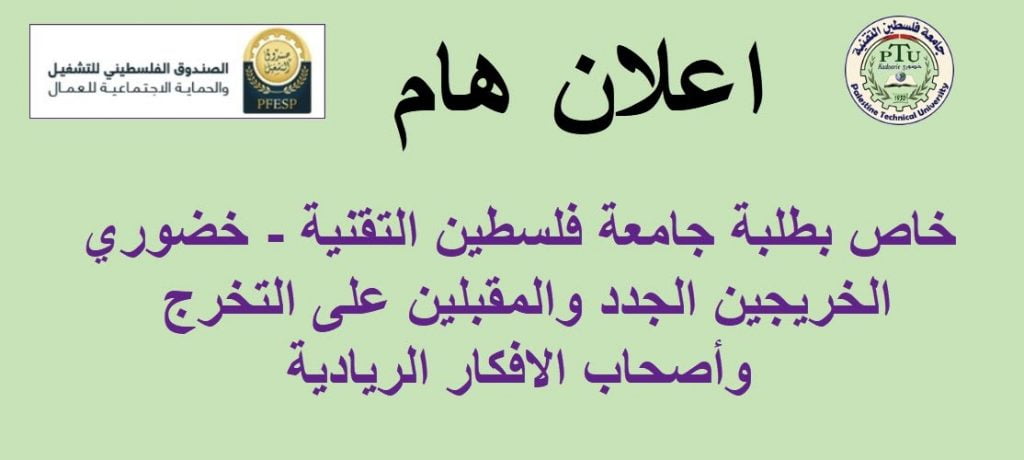 يدعوكم مركز تكنولوجيا التعليم والابداع وعمادة شؤون الطلبة بجامعة فلسطين التقنية – خضوري، الى الالتحاق بإحدى ورشات العمل التي سينفذها الصندوق الفلسطيني للتشغيل والحماية الاجتماعية للعمال، والتي تستهدف الخريجين والريادين وأصحاب الأفكار الريادية.