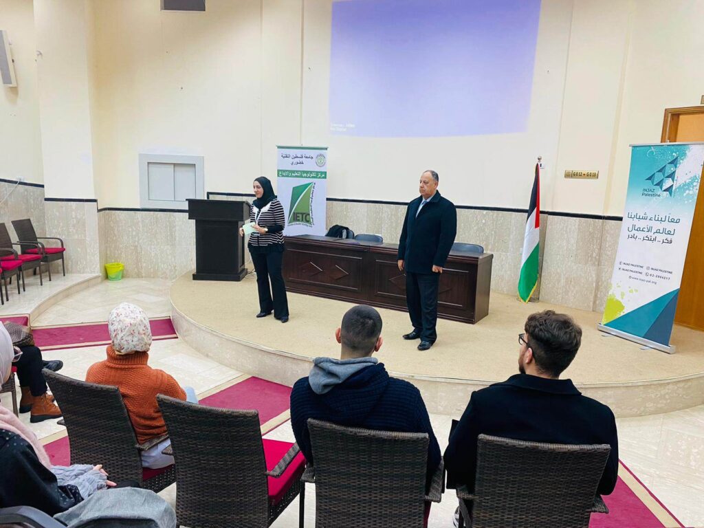 من جانبها قدمت أ.دانية حبايب للحضور تعريفا عن مؤسسة انجاز فلسطين وعرضا عن فقرات ومراحل عمل بناء الشركة الطلابية، وأعلنت ان المؤسسة الشريكة في تنفيذ التدريب لهذا العام ستكون شركة التيسير للاعمار ممثلة بالمهندس علي عودة ، والذي قدم تعريفا بالشركة وامكاناتها واستعداد الشركة لتقديم المعلومات اللازمة لانجاح الشركة.