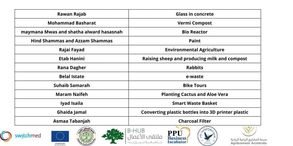 أعلن اليوم عن فوز مشروعين من جامعة فلسطين التقنية خضوري في تصفيات مسابقة الريادة الخضراء على مستوى الوطن وهما مرام نايفه عن مشروعها صبارة ، وروان رجب عن مشروعها Glass in Concrete .، جاء ذلك الاعلان في جامعة بيرزيت بحضور ممثلين عن مؤسسة سويتشميد وشركاء الشبكة الفلسطينية الخضراء وممثلين عن وزارة الاقصاد الوطني، حيث تم الاعلان عن فوز 13 مشروعا تأهلت للاحتضان لمدة 8 اشهر ومن ثم تمويلها لتصبح شركات ناشئة ، وقد تقدم لهذه المسابقة 38 مشروعا من جميع محافظات الشمال.