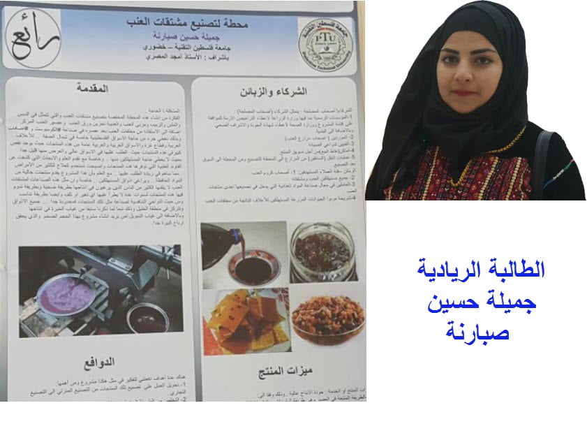 الطالبة جميلة حسين صبارنة من جامعة فلسطين التقنية خضوري وتدرس في كلية العلوم الزراعية ، التحقت ببرنامج رائع في مركز تكنولوجيا التعليم والابداع بالجامعة ، وانضمت الى فريق المشاريع الريادية ، خلال التدريبات استطاعت الطالبة تطوير مشروع محطة تصنيع مشتقات عالية الجودة من العنب والفواكه والاستفادة من مخلفاتها ، وقد نجحت الطالبة في انتاج كميات ذات جودة من المشتقات مثل الملبن والدبس والزبيب وغيرها .